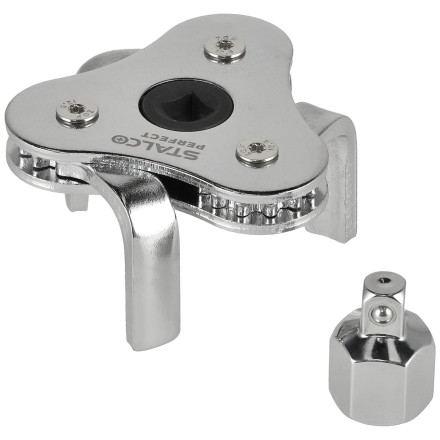 Visokokakovosten 3-čeljustni ključ za oljne filtre, idealen za profesionalce. Vključuje redukcijo za večjo prilagodljivost.