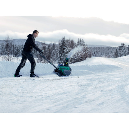 SBS40BL je opremljen z LED osvetlitvijo za boljšo vidljivost v slabih svetlobnih pogojih, kar omogoča varnejše delo tudi v mraku. Velika kolesa in udoben ročaj zagotavljajo stabilnost in enostavno upravljanje. Z enostavno nastavitvijo metanja boste brez težav očistili poti in dvorišča.