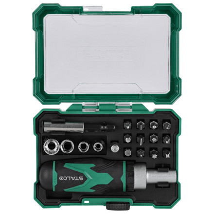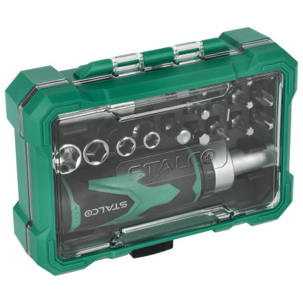 Set nastavkov in vtičnic 1/4” iz vzdržljivega S2 jekla. Vsebuje 19 kosov za vsestransko uporabo.