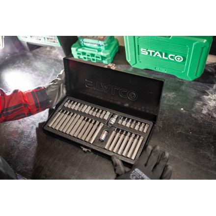 Izvijač set STALCO z 12 kosi ponuja prožnost in vzdržljivost z jeklom iz krom-vanadija in ergonomsko oblikovanim ročajem.
