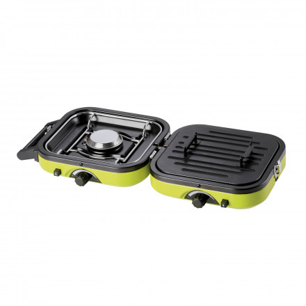 - Kuhalmnik je opremljena z dvema gorilnikoma z možnostjo zlaganja peči, kar zagotavlja kompaktnost in enostavno prenašanje.