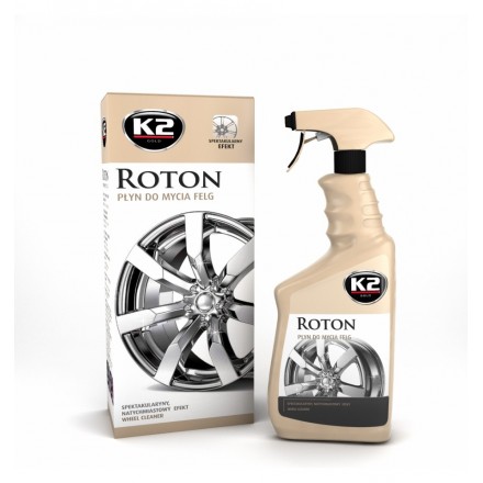 K2 Roton je čistilo za odstranjevanje kovinskih delcev z vseh zunanjih površin vozil. Odstranjuje tudi vse vrste umazanij. Povrača originalen izgled aluminijastih in jeklenih platišč. Primeren tudi za čiščenje okrasnih pokrovov. Zelo primeren tudi za odstranjevanje zračne rje. Deluje hitro in učinkovito, krtačenje v večini primerov niti ni potrebno. Ne pušča nikakršnih sledi, le čisto površino. Zaradi posebnih sestavin zmanjša nabiranje umazanije na očiščeni površini. Ima tako imenovani ''Bleeding Effect'', kar pomeni da, se sredstvo ob stiku z umazanijo obarva vijolično. Popolnoma varen za uporabo na vseh vrstah platišč, laku, plastikah in steklu.