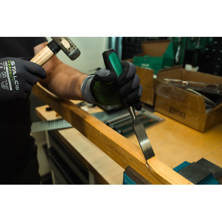 Izjemno trpežno dleto STALCO 32 mm za natančno obdelavo lesa, z ergonomsko oblikovanim ročajem in zaščito pred udarci.