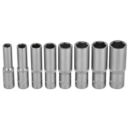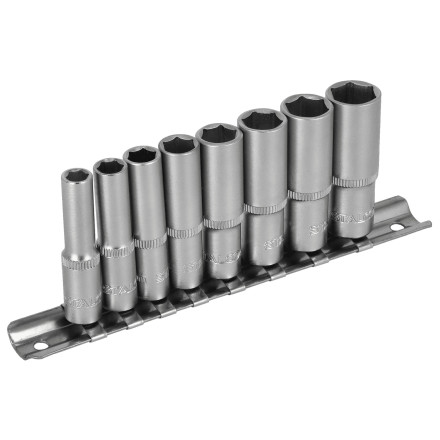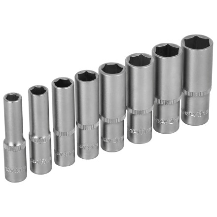Komplet 8 globokih nasadnih ključev 1/4”, idealen za natančna mehanska in gradbena dela. Izdelan iz trpežnega CrV jekla.