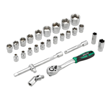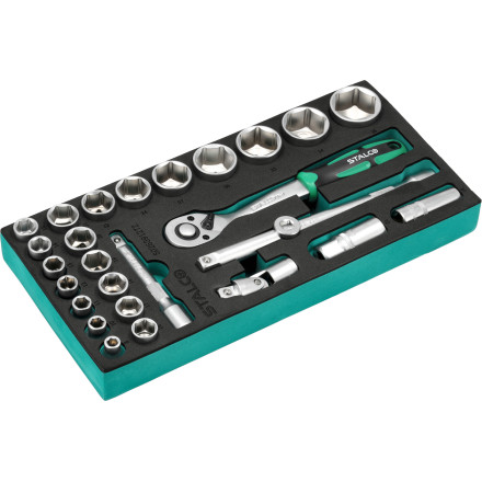 Ta set je zasnovan za odvijanje in privijanje različnih navojnih spojev, kar ga naredi nepogrešljivega v vsaki delavnici. Kompatibilen je z vsemi orodnimi omaricami STALCO in zavzame le 1/3 predala, kar omogoča učinkovito organizacijo delovnega prostora.