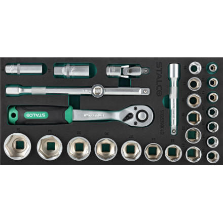 Izjemno kakovosten set nasadnih ključev CrV z ragljo, idealen za profesionalne delavnice. Vsebuje 27 kosov v EVA pladnju.