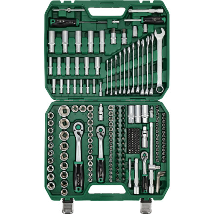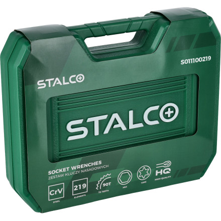 Obsežen komplet nasadnih ključev in kombiniranih ključev, uporaben v vsaki delavnici. Z 219 kosi je eden najobsežnejših v celotni ponudbi orodij STALCO. Vključuje pribor in orodje, potrebno za delo z vijaki. Komplet nasadnih ključev in kombiniranih ključev vključuje celoten komplet nasadnih ključev od 4 do 32 mm. Nasadni ključi ustrezajo steblom velikosti 1/4-, 3/8- in 1/2-palca in so na voljo v dveh dolžinah. Komplet vključuje široko paleto nastavkov z nasadnimi ključi: ravnimi, križnimi in TORX. Komplet vključuje tudi kombinirane ključe, raglje, izvijač in vrsto dodatnega pribora za orodje. Vsi predmeti so shranjeni v plastičnem kovčku s kovinskim zaklepom.