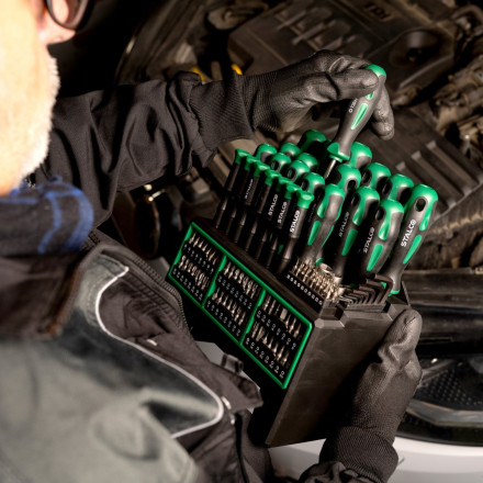 Komplet izvijačev STALCO s 114 kosi, vključno z različnimi nastavki CrV, je popoln za vsak delovni prostor.
