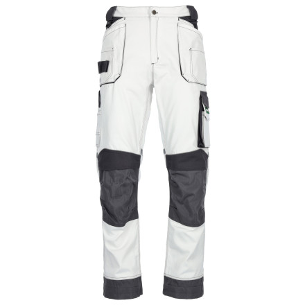 Udobne bele delovne hlače z okrepljenimi koleni in odsevnimi vložki za večjo varnost pri delu.