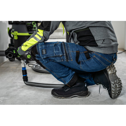 Udobne in vzdržljive jeans hlače z ojačanimi koleni, idealne za delo in prosti čas.