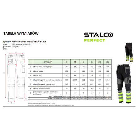 Hlače STALCO PERFECT DURA TWILL imajo številne ojačane elemente. Trojni šivi, ojačani z zaponkami, zagotavljajo vzdržljivost. Na kritičnih mestih je uporabljena raztegljiva tkanina, ki ponuja udobje, odporno na trganje, in neomejeno gibanje. Zanke za pas so prav tako ojačane, žepi na ježka pa so dodatno všiti.