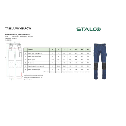 Sodobne in funkcionalne delovne kavbojke DANNY iz linije STALCO združujejo udobje klasičnih kavbojk z vzdržljivostjo profesionalnih delovnih oblačil. Izdelane so iz raztegljivega in trpežnega težkega jeansa, zato se odlično prilegajo in zagotavljajo svobodo gibanja med delom. Zahvaljujoč modnemu kroju in vsestranski barvni shemi (mornarsko modra in črna) se odlično obnesejo tudi kot osnovni kos garderobe za vsakodnevno uporabo.