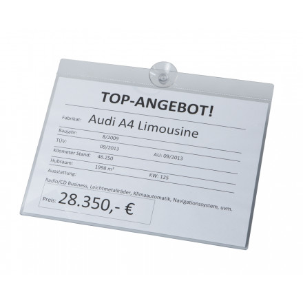 Nosilec cenika za profesionalen prikaz cen za vsa motorna vozila iz nelomljivega in trpežnega polikarbonata s priseskom in kaveljčkom za pritrditev na stransko steklo ali vzvratno ogledalo.