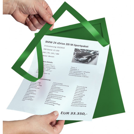 Z barvnimi paspartuji na preprost način oblikujete privlačne nosilce cenikov in preusmerite pozornost strank neposredno na ponudbo. Na voljo v petih različnih barvah. Popolna podpora prodajnim dejavnostim pri prodaji rabljenih vozil.