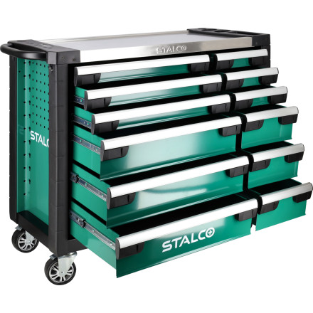 Odkrijte robustno omarico za orodje s 12 predali in nerjavečo ploščo, zasnovano za optimalno shranjevanje in organizacijo.
