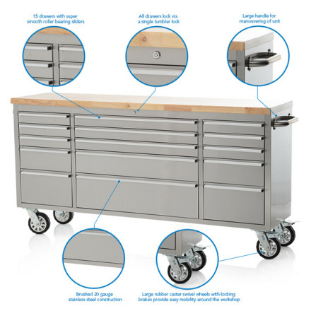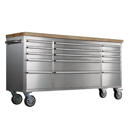 Kakovosten in prostoren voziček za orodje SMART 15 SS je idealna rešitev za urejeno in varno shranjevanje orodja v delavnici, garaži ali industrijskem okolju. Izdelan je iz trpežnega nerjavečega jekla, ki zagotavlja dolgo življenjsko dobo ter odpornost proti prstnim odtisom.