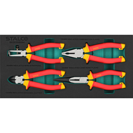Profesionalni vložek za omaro za orodje iz pene EVA je zasnovan za optimalno shranjevanje klešč. To orodje je certificirano za napetosti do 1000 V, ima certifikat VDE GS in izpolnjuje zahteve standarda IEC 60900. Vložek ustreza vsem omaricam za orodje STALCO in STALCO PERFECT.