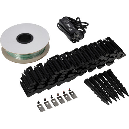 Polnilna postaja, 6 pritrdilnih kljukic za polnilno postajo, napajalnik, mejna žica 170 m, 230 kljukic za pritrditev mejne žice, komplet 3+6 rezil z pritrdilnimi vijaki, distančni trak za označevanje razdalje