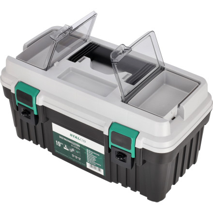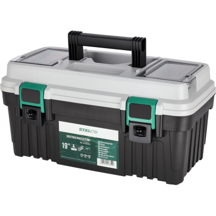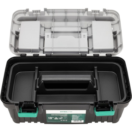 Plastični kovček za orodje z ergonomsko ročico, dvema organizatorjema in izvlečno polico.