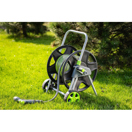 Praktičen kovinski voziček za cev do 60m, ki omogoča enostavno zalivanje in urejenost vrta.