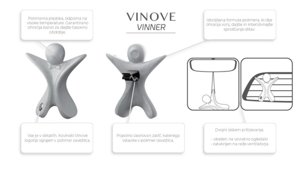 Avtomobilski osvežilci Vinove so obstojni do 90 dni. Diskretni vonj se počasi sprošča zaradi koncentriranih dišavnih esenc in tehnološko naprednih polimerov, ki se uporabljajo kot sredstvo za aromo.