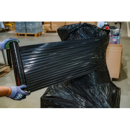 Črna stretch folija 50 cm je idealna za zaščito in stabilizacijo tovora med transportom. Odporna na vlago in trganje.
