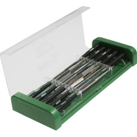 Set 10 dvoreznih pil dolžine 140 mm za natančno obdelavo. Priložena plastična škatla za enostavno shranjevanje.