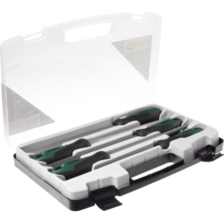 Komplet 6 dvoreznih pilnikov dolžine 140 mm za natančno obdelavo. Vključuje ergonomski ročaj in priročno plastično škatlo.