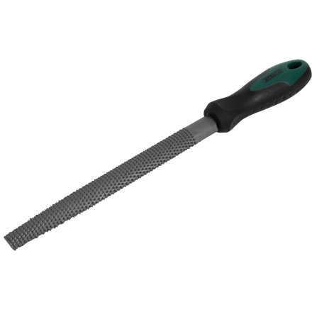 Izjemna polkrožna lesena rašpla dolžine 200 mm z dvokomponentnim ročajem za optimalen oprijem in natančno obdelavo lesa.