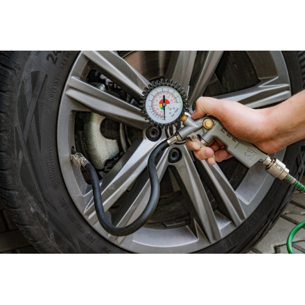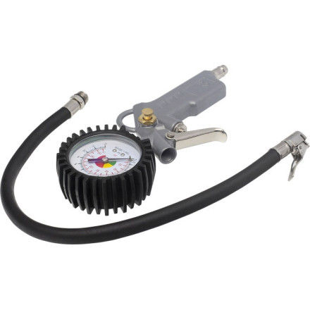 Pnevmatska pištola za polnjenje pnevmatik z merilnikom tlaka do 12 barov in cevjo dolžine 400 mm. Idealna za profesionalno in domačo uporabo.