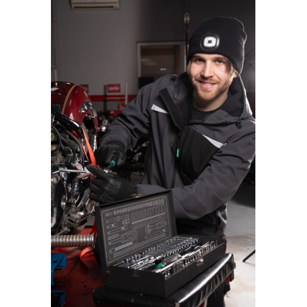 Kapa RAY znamke STALCO z LED svetilko zagotavlja svetlobo med delom in vam pušča proste roke. Ta kapa ni primerna le za delo, temveč tudi za vsakodnevno uporabo – za sprehode ali kolesarjenje, kjer sta varnost in vidljivost po temi bistvenega pomena. Je mehka, gosto pletena, dvoslojna in se prepogne na čelu, kar zagotavlja toplotno udobje v hladnih dneh. Njena elastična pletenina se popolnoma prilega obsegu glave.