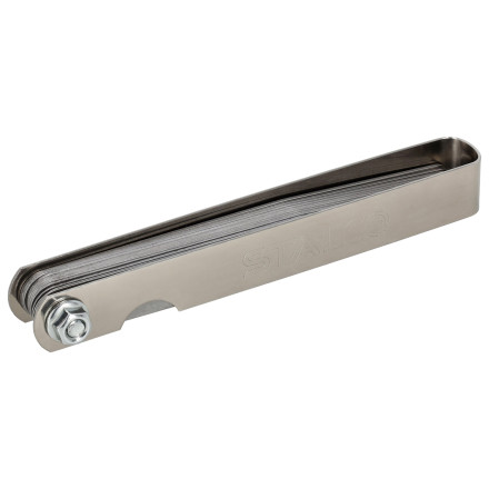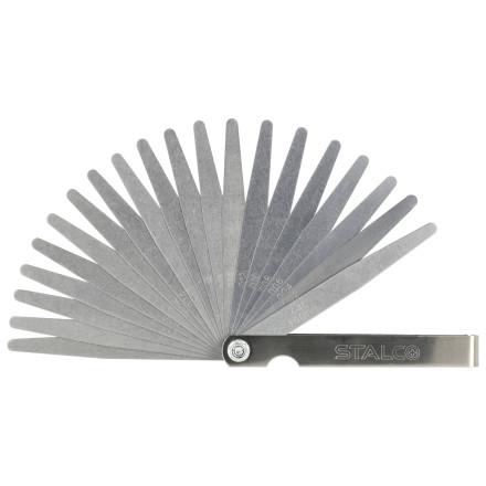Merilna sonda z 20 rezili (0,05–1,0 mm) iz nerjavečega jekla – orodje, ki se uporablja za merjenje in nastavitev zračnosti ventilov v motorjih z notranjim zgorevanjem.