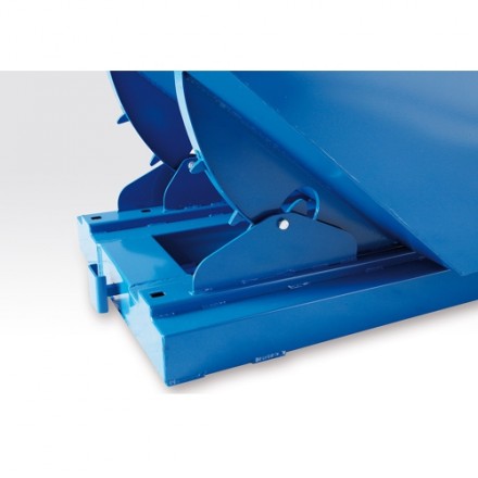 - Na sprednjem delu posode na žepih za viličarja je gumb, ki se aktivira s pritiskom na rob posode za odpadke.