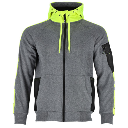 Udobna in stilska siva hoodie, izdelana iz kakovostne mešanice bombaža in poliestra, primerna za delo ali prosti čas.