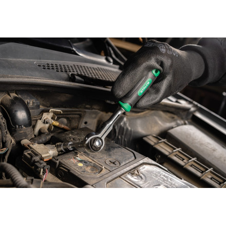 Rokavica za bite in nasadke 1/4” z 72 zobmi omogoča natančno delo v tesnih prostorih. Izdelana iz trpežne CrV jekla.