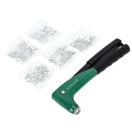 Riveter 270 mm z robustnim jeklenim ohišjem in dolgim ročajem za enostavno uporabo. Vključuje 4 zamenljive konice.