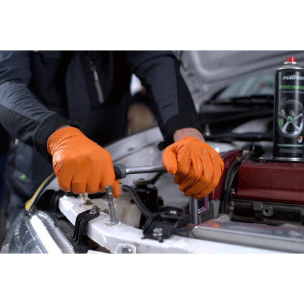 Zaščitne nitrilne rokavice NITRAX GRIP v oranžni barvi, odporne na kemikalije, zagotavljajo odličen oprijem in udobje.