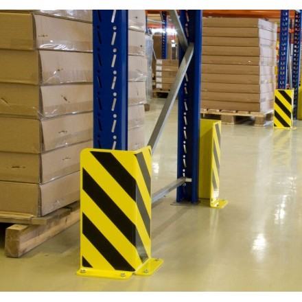 Ščitnik za noge regalov Crash Stop zagotavlja zaščito po standardu BGR in ima TÜV certifikat. Ščitnik pred trki oblike L, je primeren za zaščito vogalov. Uporablja se kot zaščita pred trki za skladiščno opremo, zaščitno mrežo za stroje, sisteme predelnih sten. Je rumene RAL 1023 barve, z črnimi trakovi za boljšo vidljivost. Primeren za notranjo uporabo. Enostavna montaža.