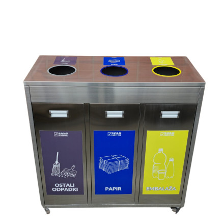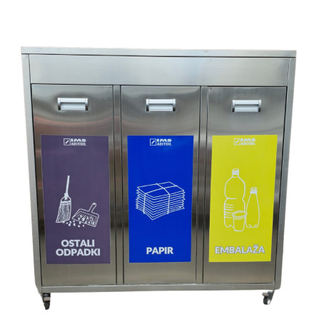 Komplet sistem za ločevanje, izdelano iz kvalitetne nerjavne pločevine. Opremljen je z kvalitetnimi kolesi z zavoro in cinkanimi kovinskimi vložki. Omogoča enostavno praznjenje koša in sila enostavno manipulacijo. Opremljen z piktogrami in nalepkami.