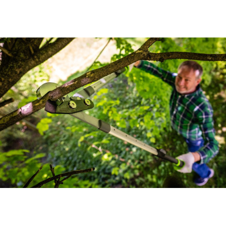 Visokokakovostne teleskopske škarje z jeklenim rezilom za učinkovito rezanje suhih vej. Udobni, nedrseči ročaji.
