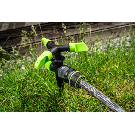 Učinkovit rotacijski zalivalnik s stabilno osnovo za enakomerno zalivanje vašega vrta. Premer zalivanja do 10 m.