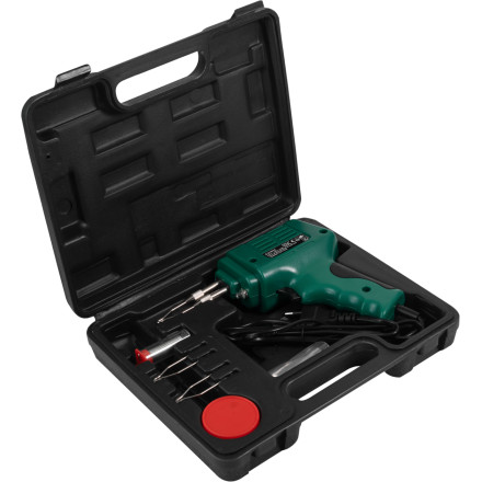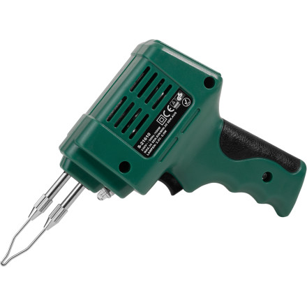Učinkovita 100 W transformer spajkalna pištola z vgrajeno osvetlitvijo za natančno spajkanje. Priložena plastična škatla za shranjevanje.