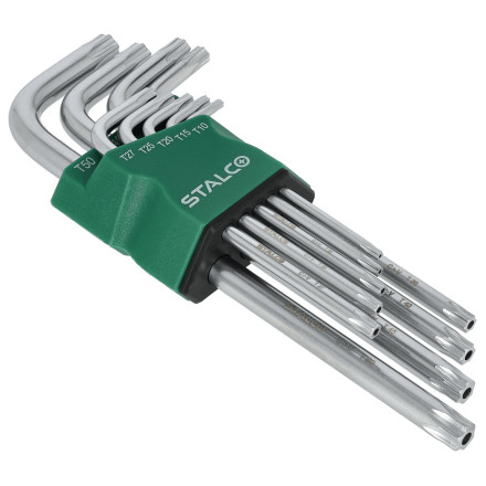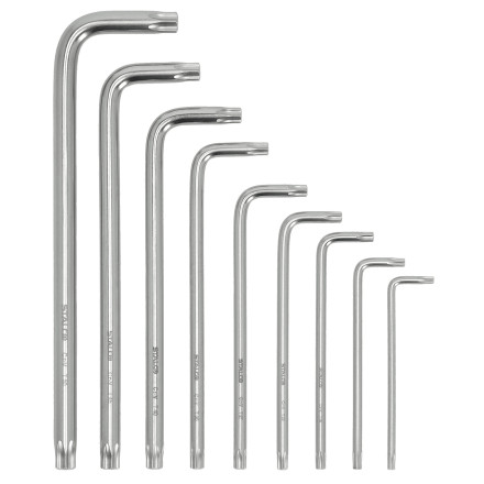 Set ekstra dolgih TORX ključev z luknjo za natančno delo v težko dostopnih mestih. Vključuje 9 ključev iz trpežnega CrV jekla.