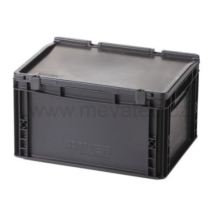 Zaboj s pokrovom, iz električno prevodne plastike, za varno shranjevanje in transport občutljivih elektro komponent. Preprečuje elektrostatičnost v vseh smereh. Močna konstrukcija zagotavlja stabilnost in varnost. Gladka notranja površina omogoča enostavno čiščenje. Zabojniki so s pokrovom povezani z dvema pantoma. Na sprednji strani imajo dvojno zapiralo za večjo varnost.