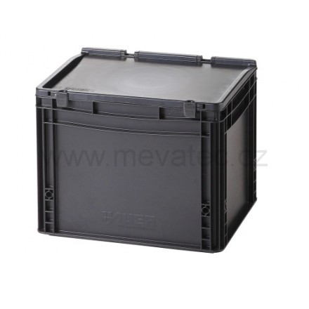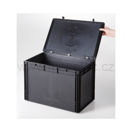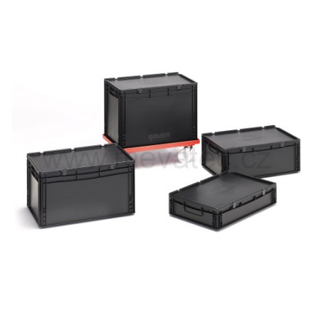 Zaboj s pokrovom, iz električno prevodne plastike, za varno shranjevanje in transport občutljivih elektro komponent. Preprečuje elektrostatičnost v vseh smereh. Močna konstrukcija zagotavlja stabilnost in varnost. Gladka notranja površina omogoča enostavno čiščenje. Zabojniki so s pokrovom povezani z dvema pantoma. Na sprednji strani imajo dvojno zapiralo za večjo varnost.