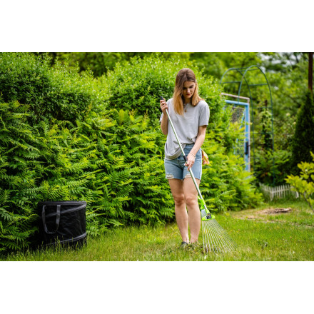 Lahke in trpežne grablje za listje s 50 cm delovno širino in udobnim aluminijastim ročajem.