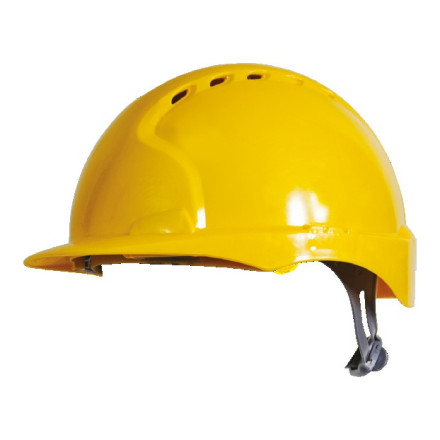 Industrijska zaščitna čelada EVO3 v rumeni barvi nudi izjemno zaščito in udobje z nastavljivim pasom ter učinkovitim prezračevanjem.