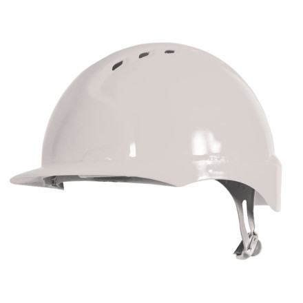 Industrijska zaščitna čelada EVO3 v beli barvi ponuja vrhunsko zaščito in udobje z nastavljivim pasom in zračenjem.