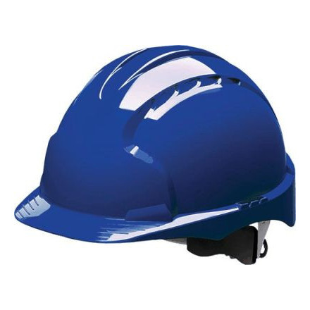 Modra industrijska zaščitna čelada EVO3 nudi vrhunsko zaščito in udobje z nastavljivim 6-točkovnim pasom in učinkovitim prezračevanjem.
