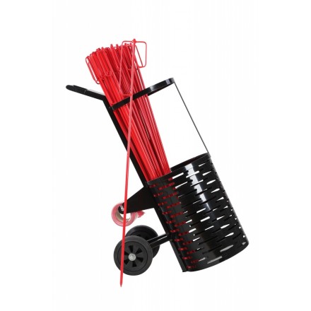 Voziček za shranjevanje in prevoz zapornih stebričkov, ponuja hiter in enostaven način za zapiranje in označevanje velikih površin. Voziček ima na zadnji strani nosilec za označevalni trak in rumeno-bel trak, s katerim lahko hitro povežemo stebričke in enostavno zapremo območje.